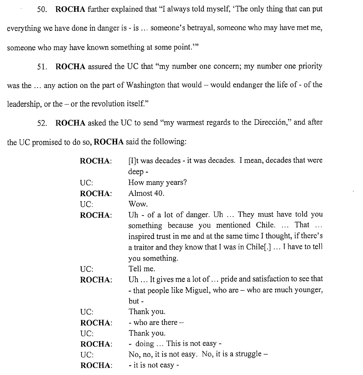 Miguel Rocha’nın itiraflarına rağmen henüz hakkındaki suçlamalar kesinleşmedi. Rocha, FBI’nin tespit ettiği üzere gerçekten Küba ajanı olsa dahi hangi konularda bilgi sızdırdığı, ABD’ye nasıl bir zarar verdiği henüz meçhul. Miguel Rocha’nın neden Küba için ajanlık yaptığı da belirsiz. FBI’ya göre genç bir öğrenciyken sosyalist Allende’den etkilenerek 1973 yılında Şili’ye gitmiş, aynı yıl ABD’nin desteğiyle Pinochet’in Allende’yi devirmesi ve Allende’nin teslim olmamak için intihat etmesiyle ABD’ye tepki duymuş, Küba devrimine ve Castro’ya hayranlık beslemeye başlamıştı. Zira gizli FBI ajanı Şili’ye referans verince Miguel açılmış ve Küba ile ilişkisini itiraf etmiş, rahatça konuşmuştu. FBI’ya göre bu nedenle Miguel 1973 yılında Şili’de Küba istihbaratıyla çalışmaya başlamıştı. Bu teori ne kadar tutarlı? Rocha hiç mi bir maddi çıkar elde etmedi? Henüz kesin bir cevap yok.