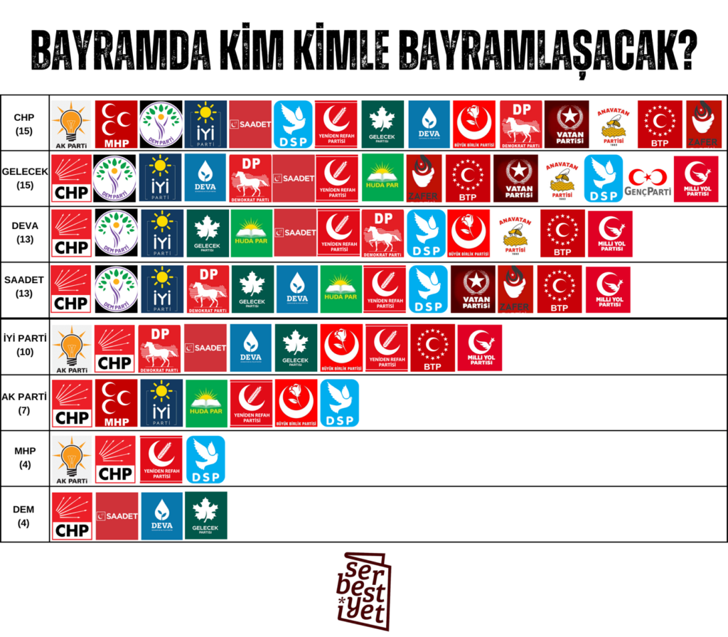 CHP yine bayramdaki en yoğun ziyaret listesi olan parti olacak: AK Parti, DSP, Vatan Partisi, DEM Parti, İYİ Parti, BBP, DP, MHP, SP, ANAP, DEVA Partisi, Gelecek Partisi, Yeniden Rafah Partisi, Bağımsız Türkiye Partisi ve Zafer Partisi’ne bayram ziyaretine gidecekler.