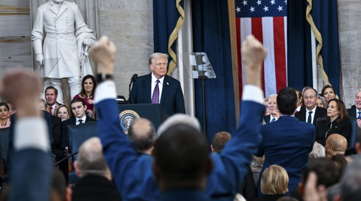 Aslında Trump, çok daha öfkeli ve intikam dolu bir şekilde başladığı ikinci döneminin fragmanını 20 Ocak’taki yemin töreninde gösterime sokmuş, anayasaya bağlılılık yemini ederken korku filmi karakteri gibi giyinen First Lady’nin tuttuğu İncil’e elini basmamıştı. Trump İncilsiz yemin eden ilk başkan değildi, örneğin daha önce John Quincy Adams da bir hukuk kitabına elini basarak göreve başlamıştı. Fakat Trump önünde İncil bulunmasına rağmen elini basmayan ilk başkan olmuş, aslında tek ayağı havada yemin etmişti.