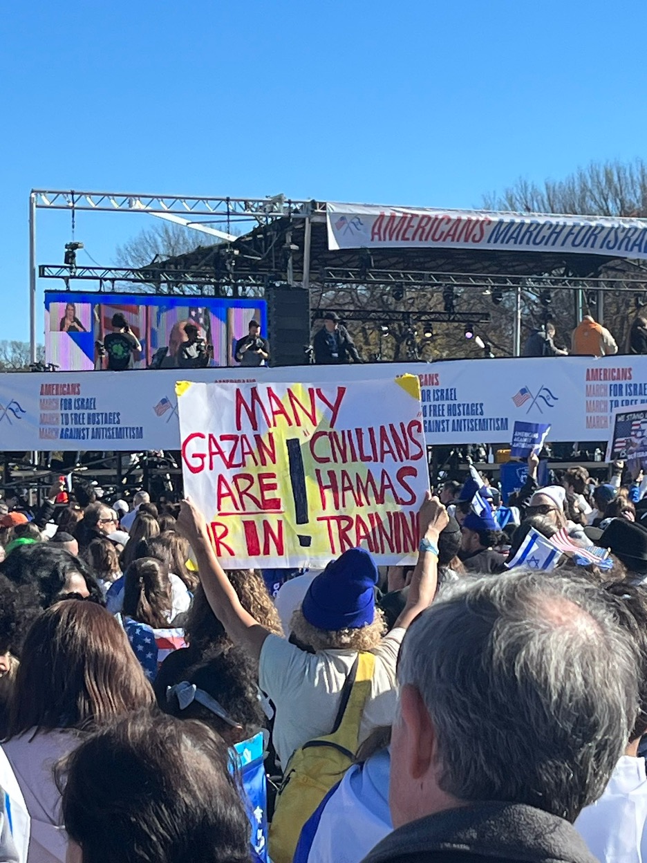 Mitingteki pankartlardan biri: “Gazzeli sivillerin çoğu bir Hamas stajyeri”