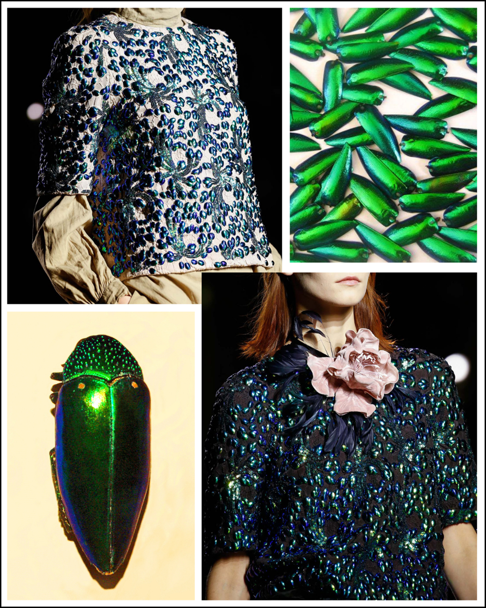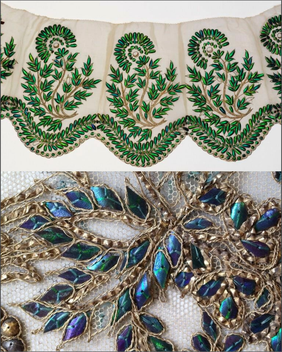 Bu kumaştaki mavi-yeşil süslemeler aslında böcek kanatları. İnsan hayret ediyor, değil mi? Böcek kanatlarını kumaşlara işleyerek kullanmak, tarihi çok eskilere uzanan bir elişi tekniği, geleneksel bir zanaat. Böcek kanatları, modada, sanatta, dekorasyonda, hatta belki de en ilginci, uzay istasyonlarında bile kullanılmış. Güneydoğu Asya (Tayland, Burma, Hindistan, Çin…) kökenli bu işleme tarzı, Hindistan’dan 1800’lerde öncelikle İngiltere’ye oradan da Kıta Avrupasına taşınmış. Üzerine işlendiği ipek, pamuk ve yün kumaşlar, yıllar içinde sararıp, yırtık pırtık olup, erise bile, bu kanatların parlaklığı asırlara meydan okuyor. Bu tabii malzemenin en yaygın kullanılanı mavi-yeşil yansımalı olanları, ama yanar döner renkleriyle, turkuaz, mor, turuncu, kırmızı, yeşil, lacivert, altın rengi ağırlıkta olanları da var. Günümüzde de ünlü moda evlerinin koleksiyonlarında, film ve dizilerde, sanat eserlerinde, mücevher tasarımlarında örneklerine rastlıyoruz.