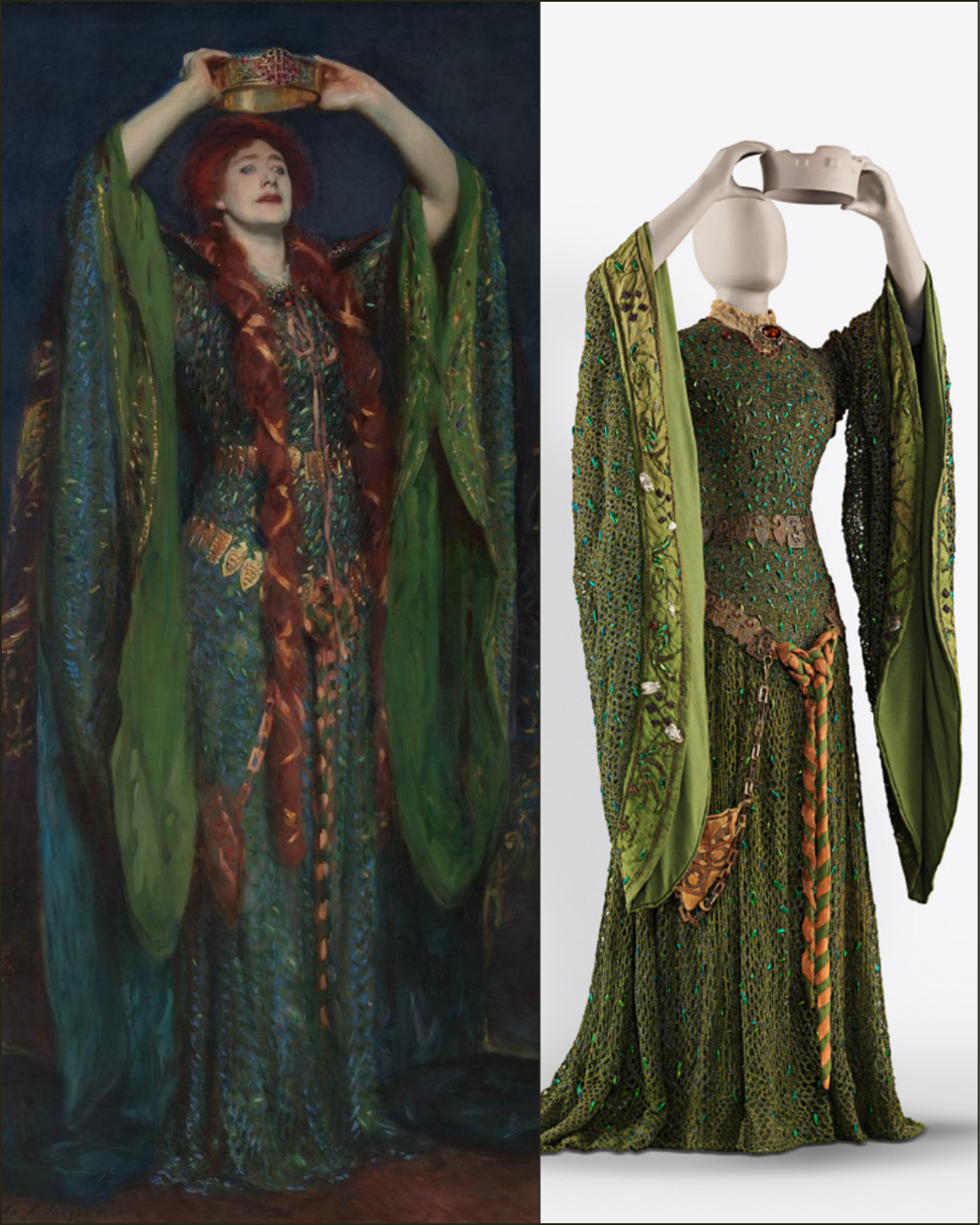 John Singer Sargent’ın ünlü Ellen Terry as Lady Macbeth tablosu, Tate Modern. Sağdaki de Ellen Terry’nin 1888’de Lady Macbeth’i oynarken giydiği elbise. (Hatta bu temsili Oscar Wilde da izlemiş, bir eserinde elbiseden hayranlıkla bahsediyordu.)