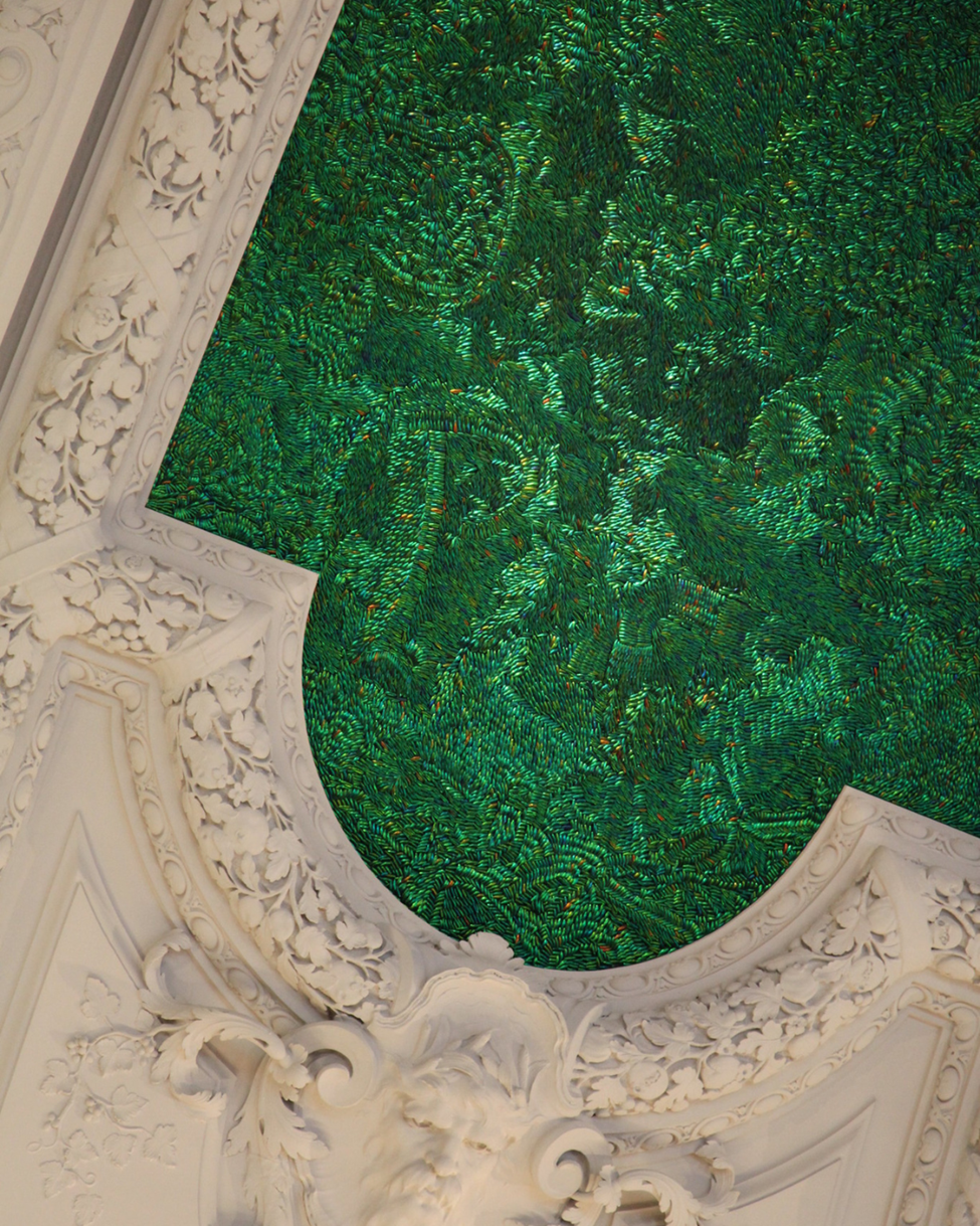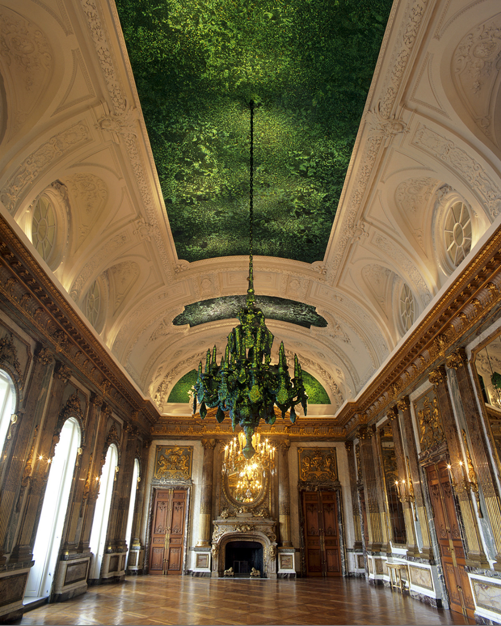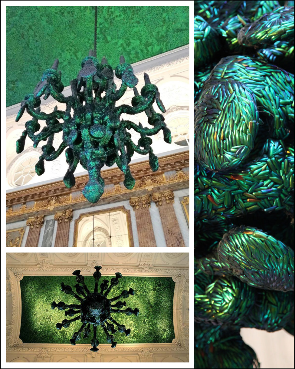 Brüksel’de Kraliyet Sarayı, Aynalı Salon. 2002 yılında Kraliçe Paola’nın sanatçı Jan Fabre’a yaptırdığı Heaven of Delight eseri. Belçikalı sanatçı bu salonun tavanlarını ve avizelerini böcek kanatlarıyla kaplamış ve bunun için tam 1 milyon 600 bin kanat kullanmış.