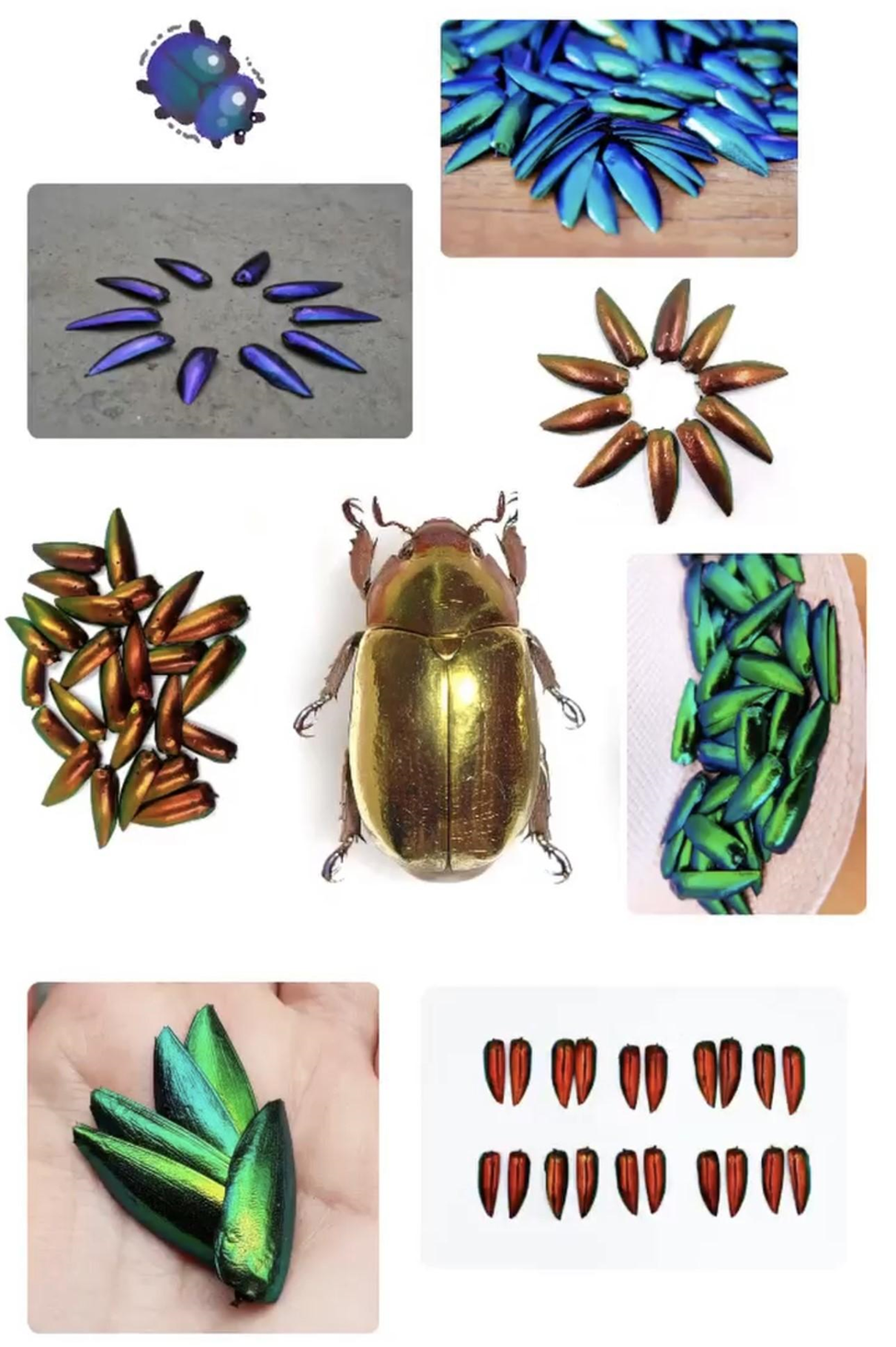 Elytra (tekilse elytron) da denen bu pullar, ömrü çok kısa olan Sternocera (Japonya’da kullanılan versiyonu Chrysochroa -Tamamushi) cinsi böceklerin yanar döner ve parlak kanatlarından elde ediliyor. Böceklerin ömrü kısacık, yetişkin olarak 1 ila 3 hafta arasında yaşıyorlar ve çiftleşmek için sürüler halinde buluşup hemen akabinde de topluca ölüyorlar. İşte bu noktada Güneydoğu Asyalılar, böceklerin yoğun yaşadığı bazı ormanlarda, kendiliğinden ölenleri topluyorlar; bu açıdan vicdanlı. Ayrıca bu böcekler, Kuzey Tayland, Laos ve Çin’de afiyetle yeniyor; gıda olarak hazırlandıkları fabrikalar kanatlarını da yan ürün olarak satıyor.
