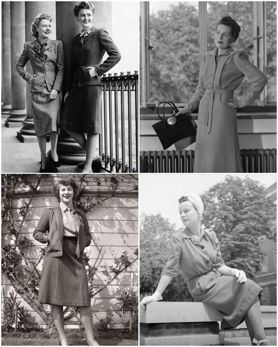 2. Dünya Savaşı sırasında giysilerin kısıtlı ve fonksiyonel çizgisine örnekler.
