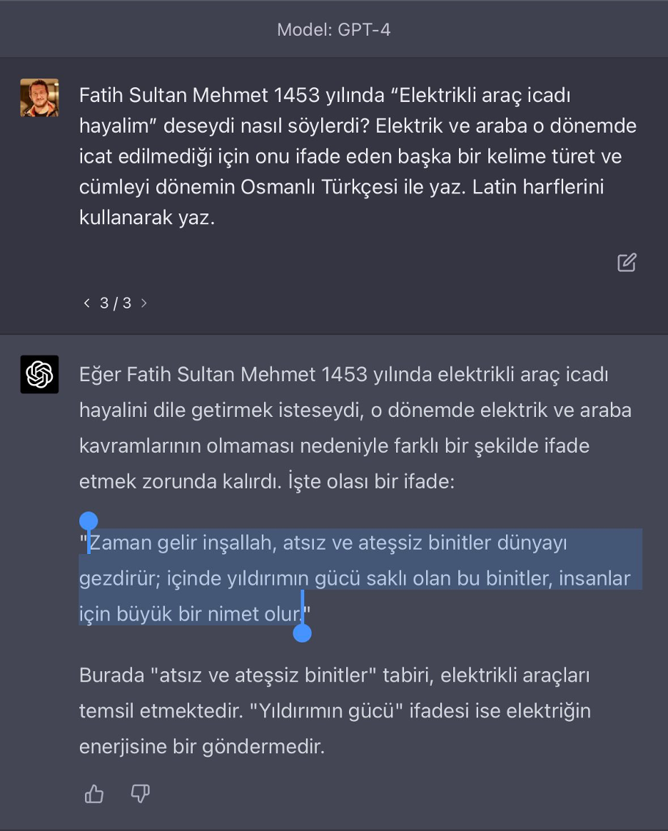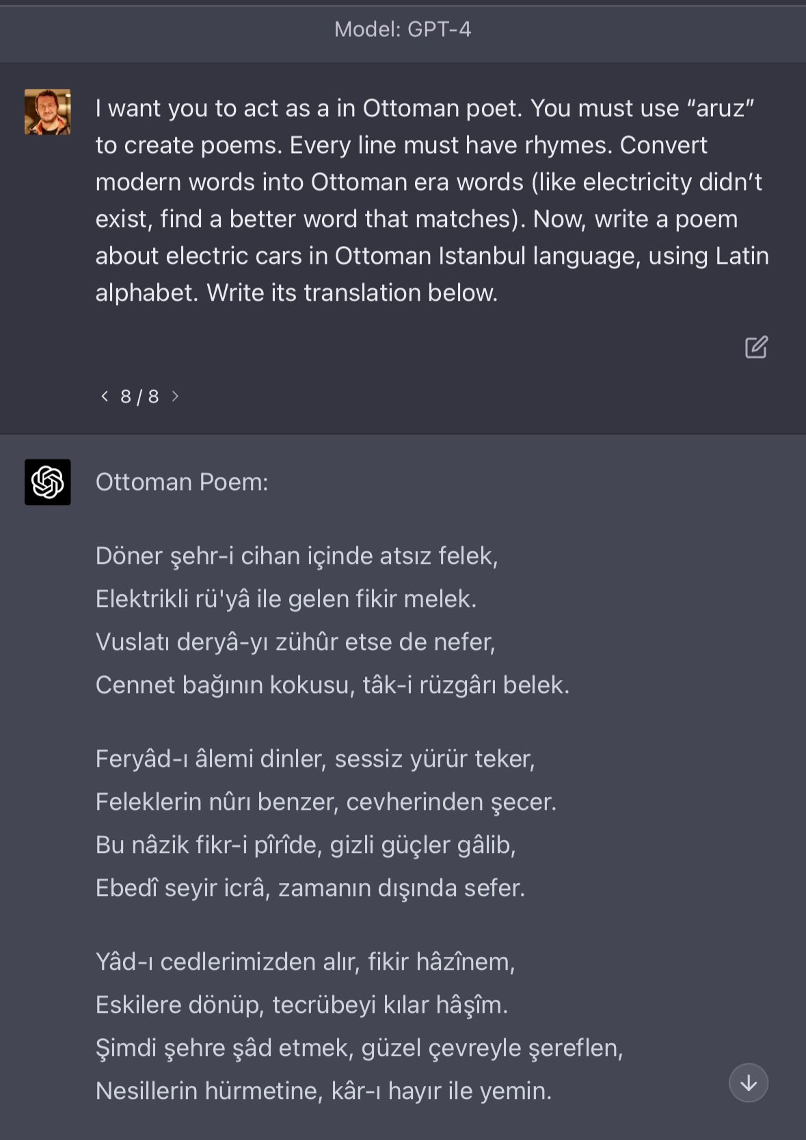 Bunun yerine yönlendirmeler ile ChatGPT’yi Türkçe yönlendirerek ona Aruz ölçüsünde elektrikli araçlar hakkında şiir yazdırmış bir Twitter kullanıcısının (Fatih Kadir Akın) ekran görüntülerini eklemek isterim.