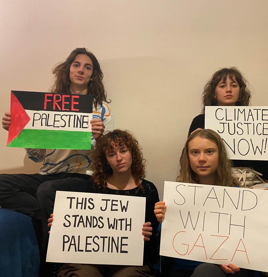 Sosyal demokrat tipik bir İskandinav dünya vatandaşı ailede büyüyen Greta büyük ihtimalle daha öncesinde Gazze ve Filistin’e dair bir bilince sahip olsa da bu konuda ses getiren bir eyleme imza atmamışken, 7 Ekim’den iki hafta sonra iklim grevi etkinliğinde “Gazze’nin yanındayım” yazan bir pankartla poz vererek konuya giriş yaptı.