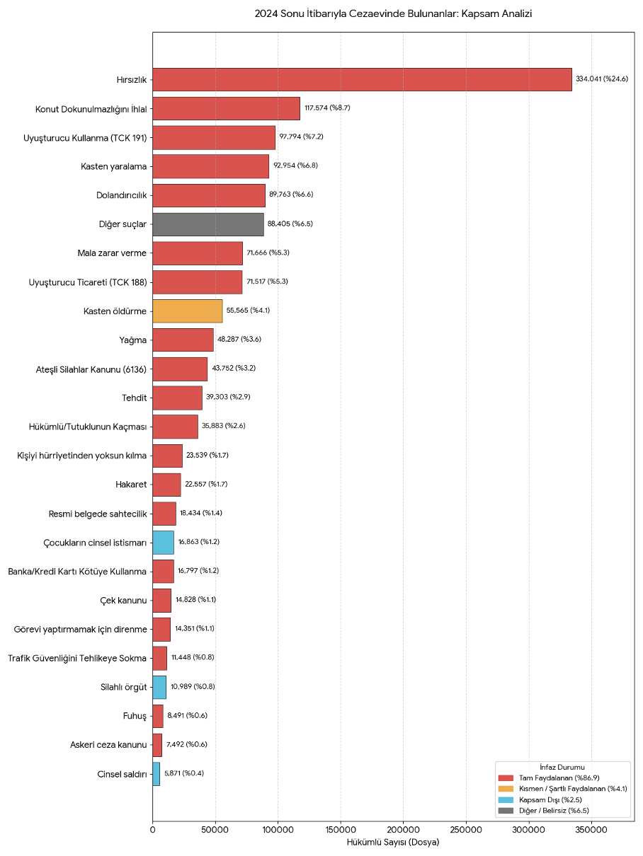 Önceki tabloları okuyucuya bırakarak ve yazıyı grafiklere boğmamak adına tek bir grafik hazırladım. 2024 yılı sonu itibariyle cezaevinde bulunan hükümlülerden hangileri infaz düzenlemesinden faydalanıyor ve oranı nedir sorusunun cevabını görselleştirmek istedim.