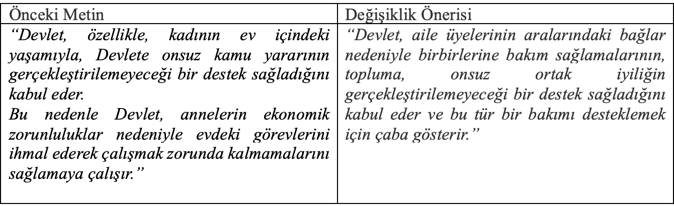 Değişiklik önerisindeki “çaba gösterir” ifadesi de muğlaktı. Nitekim referandumdan sadece günler önce Başsavcılığın raporu sızdırılmış ve başsavcılığın dahi “çaba gösterir” ifadesinden emin olamadığı, yerel mahkemelerin bu düşük profilli ifadenin devletin bakım ve ev işlerini üstlenen kişilere yönelik devlet desteği sorumluluğunu azaltıcı şekilde yorumlayabileceği endişesini taşıdığı ortaya çıkmıştı.