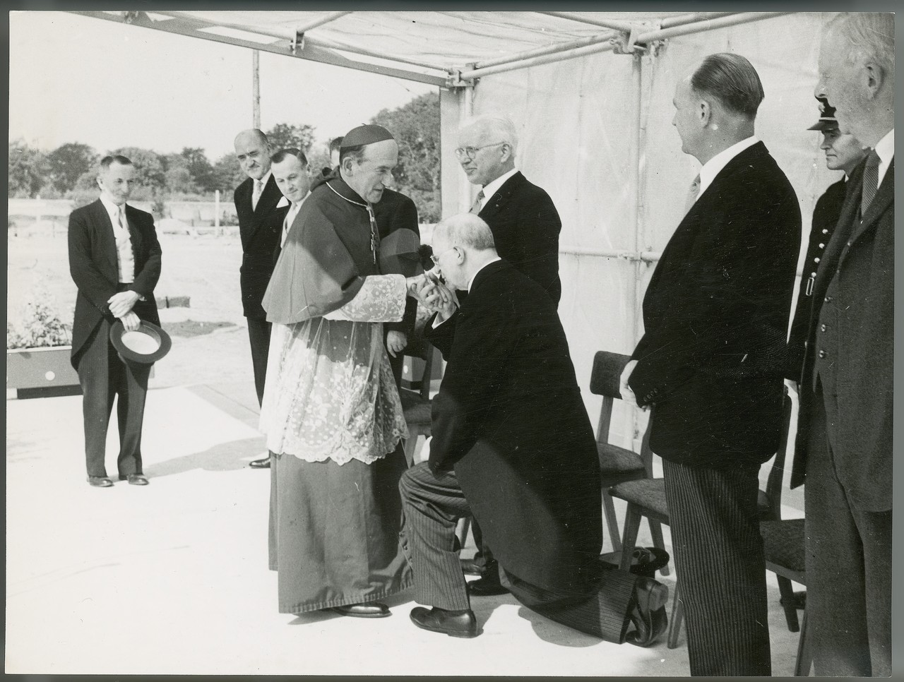 Photograph of President de Valera kissing the ring of Rev. Dr. John Charles  McQuaid Archbishop of Dublin.] - UCD Digital Library
