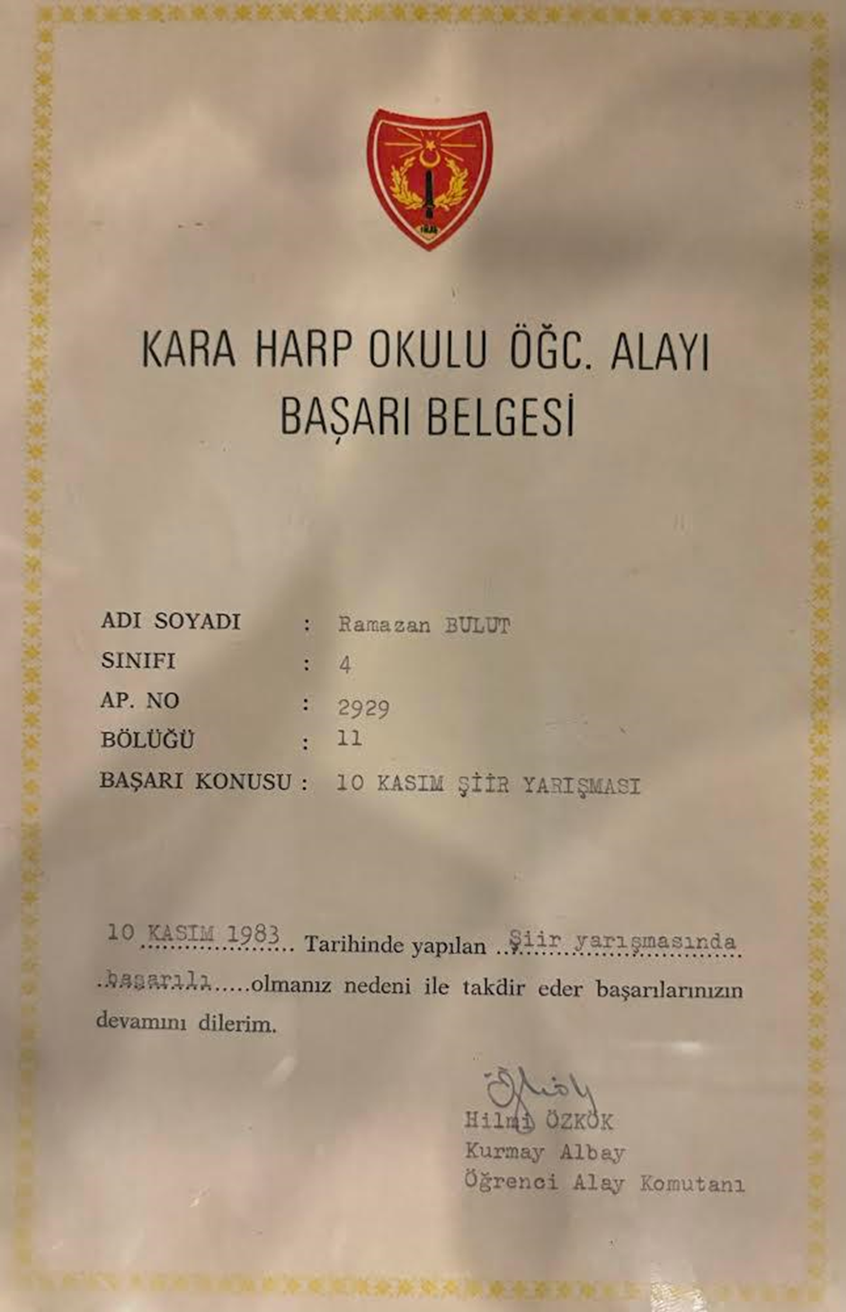 Babam, Kurmay Albay Hilmi ÖZKÖK imzalı başarı belgesini tam alacakken o sıralar radikal İslamcı bir üniversite öğrencisi olan abim belgeyi elimden çekip “Sallıyor baba! Atatürk’e şiir yazmış birinci olmuş.” diyerek beni ihbar etmez mi?