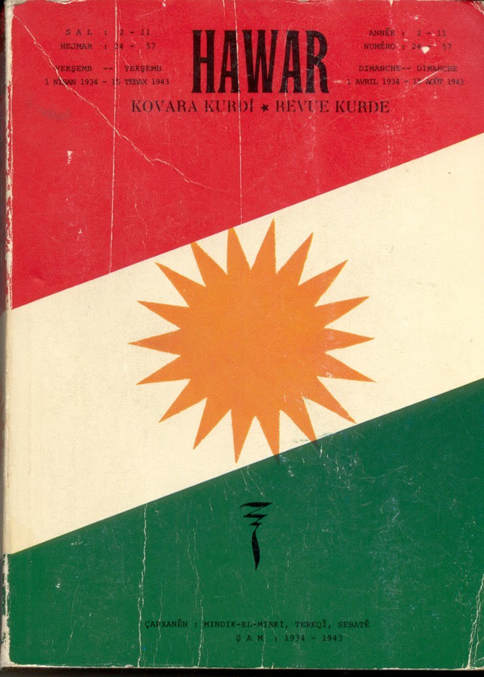 Latin alfabesiyle Suriye’de çıkarılmış ilk Kürtçe dergi Hawar. Derginin çıkış tarihi 15 Mayıs; her yıl Kürtçenin Dil Bayramı günü olarak kutlanıyor. Dergi, Fransızcasıyla iki dilli olarak yayımlanıyordu.