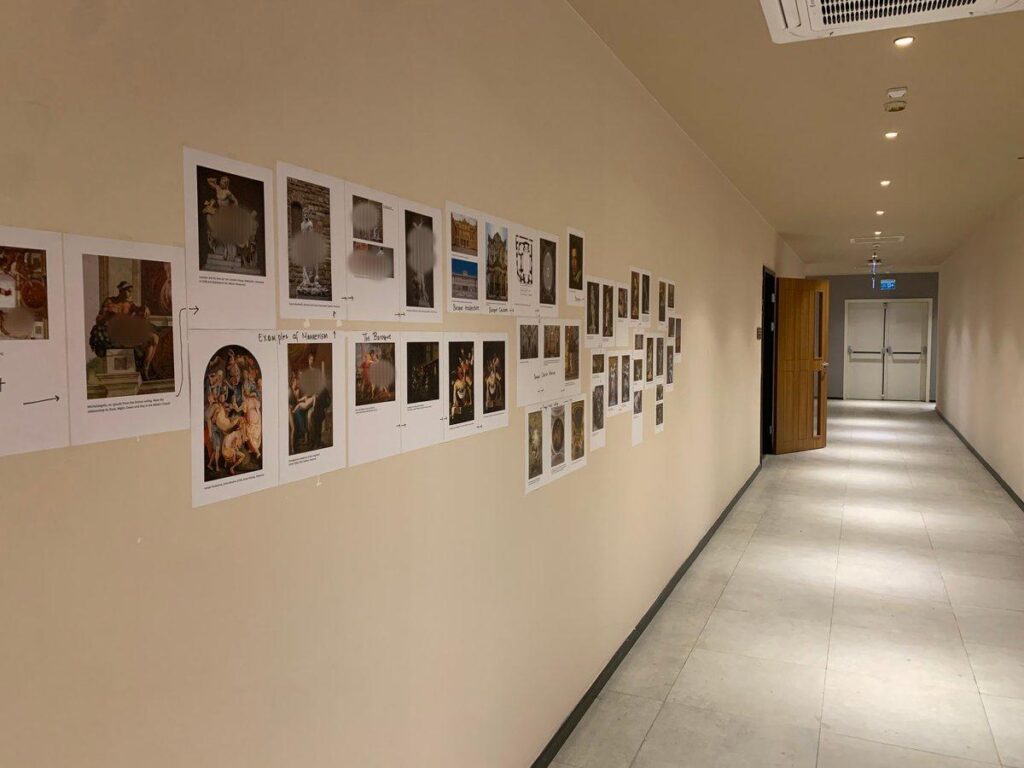 Derste üzerinde konuşulan sanat eserlerinin çıktıları alınmış, Halil Hoca ve asistanları selobantlarla 100’den fazla resmi sınavlardan önce koridorun duvarına asmışlar.