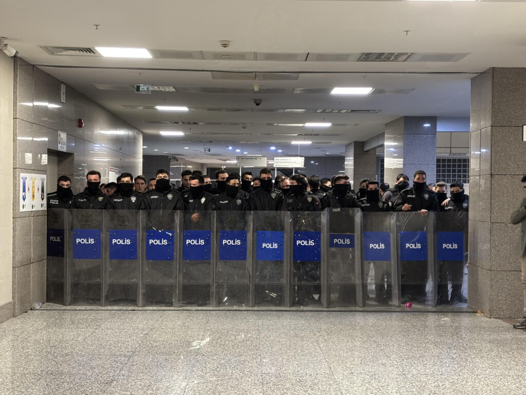 Dikkatinizi çekmek istiyorum; bu polisler adliye binası dışında değil, savcılık ve mahkeme koridorları önünde avukatlara karşı barikat oluşturmuşlardı.