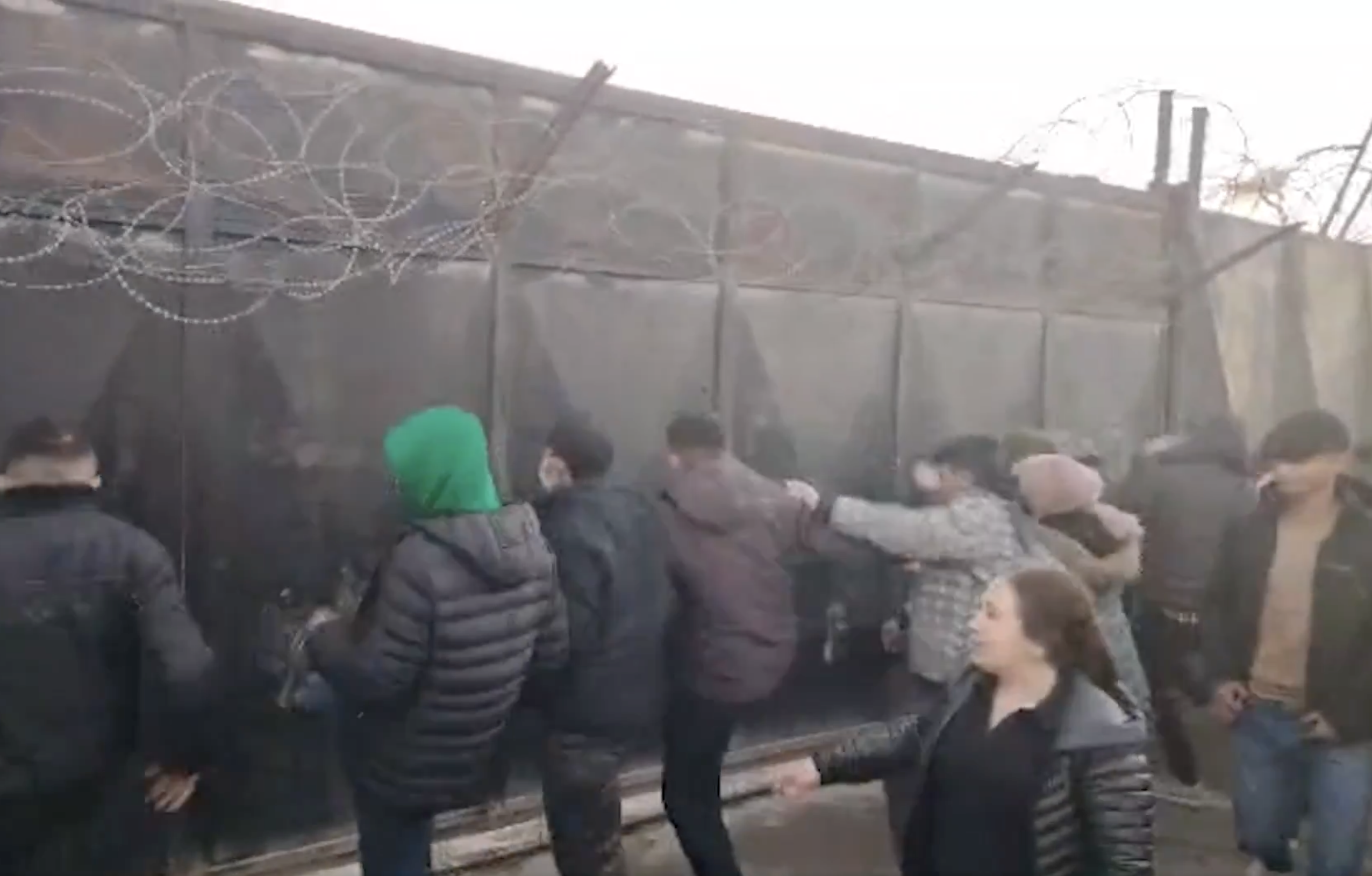 Halep’teki SDG kontrolündeki mahallelere Suriye ordusunun askeri müdahalesine karşı sessiz kaldığı için Haseke’deki ABD üssünün önünde toplananlar üssün demir kapılarını tekmelediler.