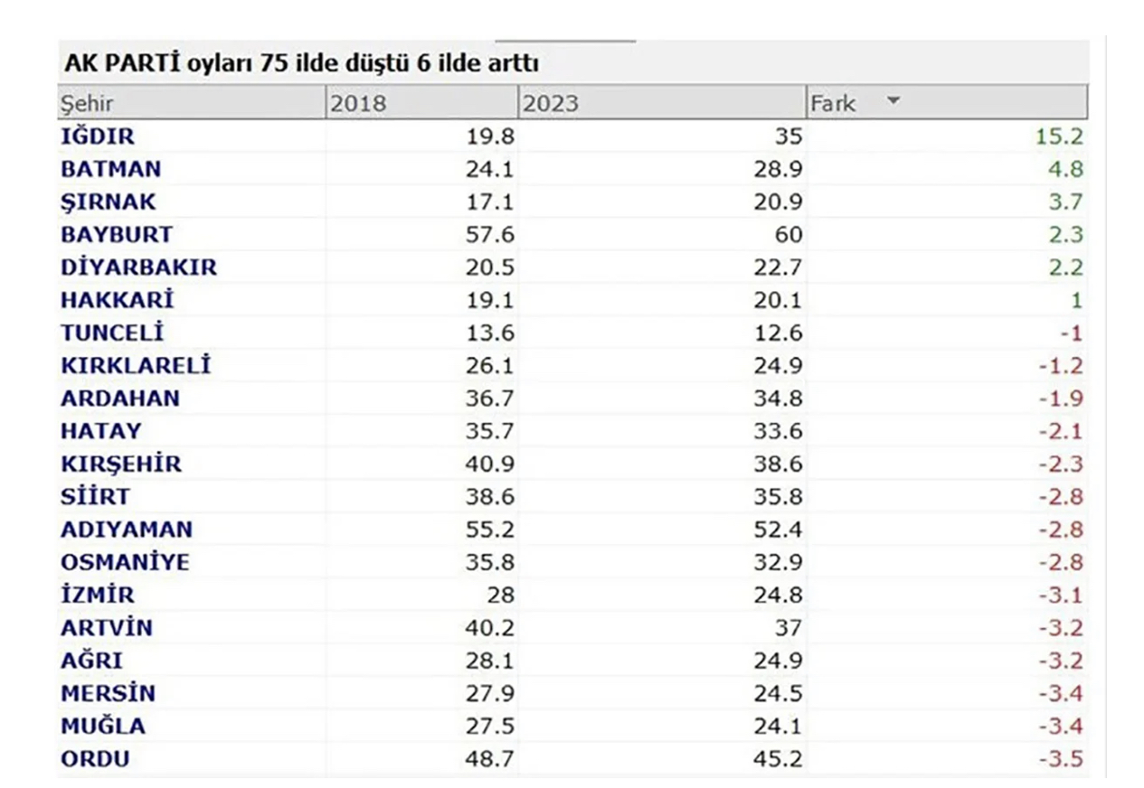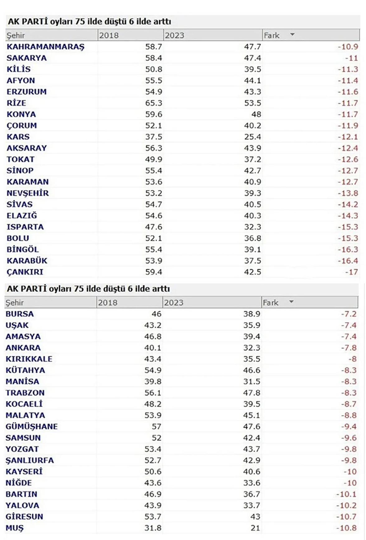 AK Parti’nin 75 ilde oyu düştü, sadece 6 ilde oyu arttı.