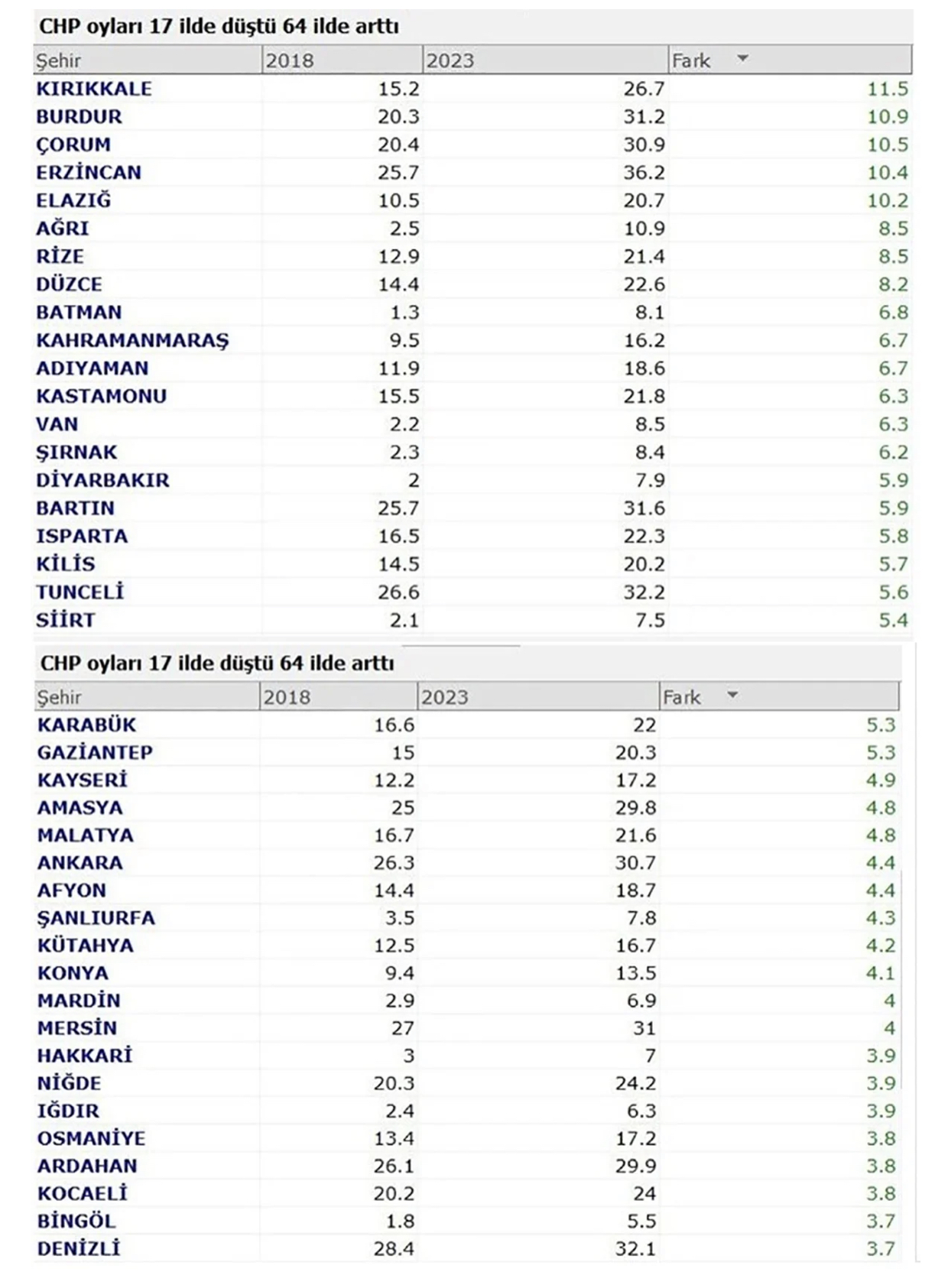 CHP’nin oyları 64 ilde arttı, sadece 10 ilde düştü. (7 ilde CHP İYİ Parti listesinden girdi)