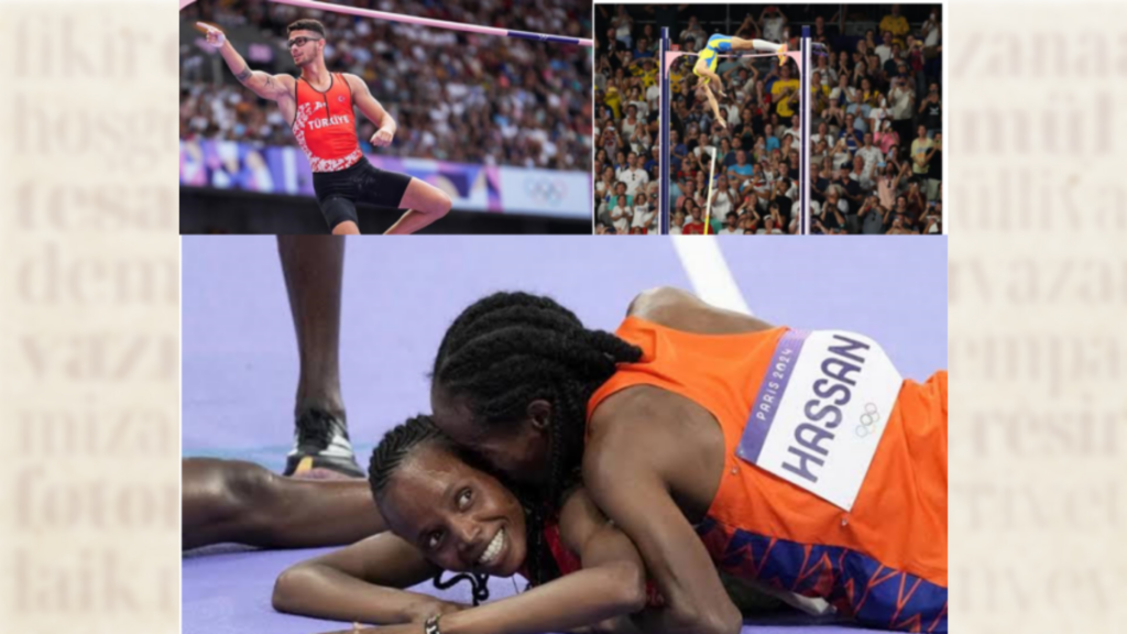 Anlıyor muyuz, rekor temposunda yüzerken bir yandan da suyun altında bağırmayı, çığlık atmayı? Üniversitede sutopu oynadım, hasbelkader. 19-20 yaşlarımdaydım. Neredeyse altmış yıl olacak. Amatördük. Gene de günde iki buçuk saat antrenman yapardık. Paçavra gibi çıkardım havuzdan (ve üstüne bir de ders çalışırdım geceyarılarına kadar.) Bir dünya ve olimpiyat şampiyonunun nasıl bir cendereden geçtiğini, nelere katlandığı ve dayandığını ancak hayal edebilirim. Ama bir şey var ki anlıyorum, çünkü o kadarını yaşadım: Ortak çilenin, ızdırabın yarattığı kardeşlik. Kim olurlarsa olsunlar, nereden gelirlerse gelsinler, çok özel bir grup, ayrı bir camia (cemaat? ümmet?) oldukları hissi. En çok, en belirgin şekliyle dekatloncular ve heptatloncularda vardır bu, çünkü benzersiz, kendi içine kapalı, klostrofobik bir cehennemde yaşarlar. Sırf toplam enerji kaybı da değildir mesele; yedi/on ayrı yarışmanın gerektirdiği farklı ve çelişik adale grupları yırtılır, yırtınır iki gün boyunca. Derken o ân gelir ve birbirlerine sarılır, yığılırlar. Yukarıda, üçüncü resme bakın. Kadınlar 5000 yeni koşulmuş. İkinci Sifan Hassan, gelmiş kendini birinci Beatrice Chebet’in üzerine atmış. Kenyalılık ve Hollandalılık yok orada. Galip mağlup, altın gümüş bronz (ve en kötü sonuç sayılan dördüncülük) yok. İnsanlık var, ortak emek var, sisterhood var.