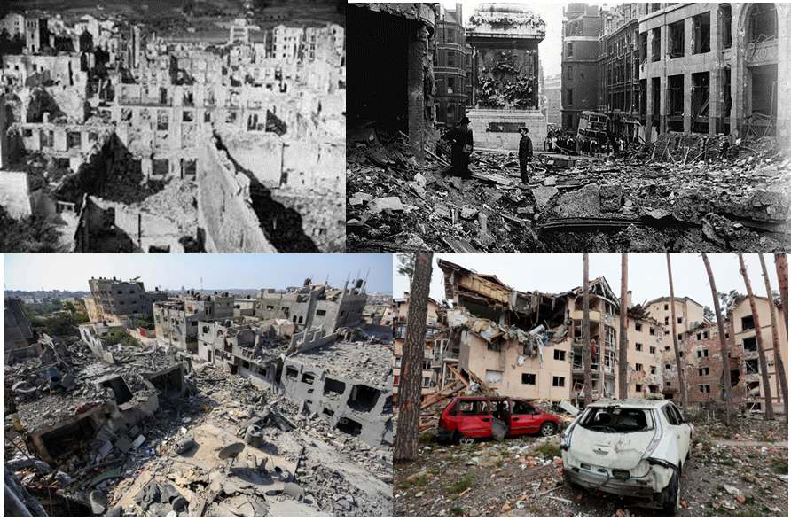 Üst solda, 26 Nisan 1937’deki Nazi-Faşist hava saldırısından sonra Guernica’nın yıkıntıları. İkinci Dünya Savaşı’nın ilk basamağı diyebileceğimiz İspanya İç Savaşı’ndan bir sahne. Üst sağda, bir sonraki etap: Alman Hava Kuvvtleri’nin 1940 sonbaharında neredeyse iki ay gece gündüz demeden bombaladığı Londra. Alt solda, günümüzde Gazze. Alt sağda, Ukrayna’nın Kyiv bölgesindeki Irpin kentinin, Rus bombardımanından sonra 2 Mart 2022’deki hali. Son ikisi, Üçüncü Dünya Savaşı’nın şimdiki ön-aşamasının görüntüleri.