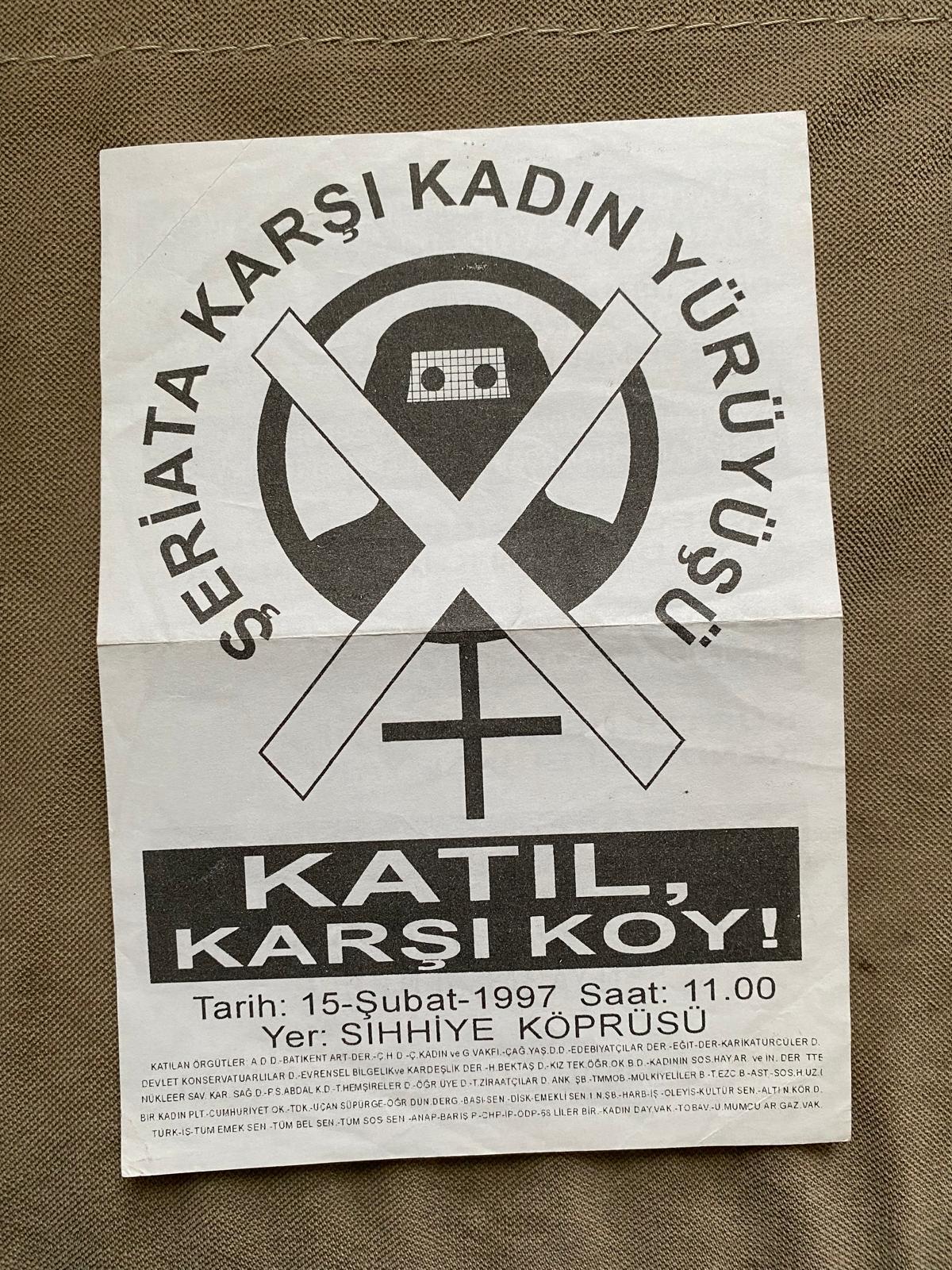28 Şubat’ı başka bir zaman yazmayı düşünüyordum. Ama bir gün yazmak için elimde tuttuğum notlar arasındaki bu bildiriyi bulunca, onu birkaç cümle bir şey yazıp paylaşmak isterken bu uzun, yazı çıktı ortaya. Bildirinin adı “Şeriata Karşı Kadın Yürüyüşü.” Tam 28 Şubat öncesi, milyonlarca insanın hayatını karartacak müdahalenin öncesi. Fadimelerin, Kalkancıların, Aczimendilerin, cin çıkarma törenlerinin ve diğer ürkütücü irtica “haberlerinin” toplumu ikna etmek için her akşam haber bültenlerini doldurduğu günler.