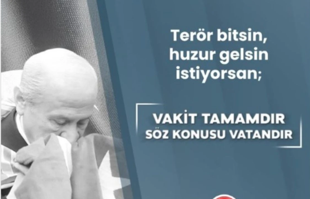 Sadece grup toplantılarındaki konuşmalarıyla da yetinmedi Bahçeli. Gerek girdiği bu yeni yolun nedenlerini izah etmek ve gerek bu yoldaki kararlılığını göstermek için, evvela bir sosyal medya kampanyası başlattı. “Vakit tamamdır” temalı mesajlar her gün aynı saatte partinin resmî hesaplarından paylaşıldı.