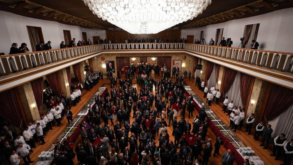 Resepsiyonda Güler’in hemen yanı başında DEM Partililer, MHP ve İYİ Partililerle sohbet ediyordu.
