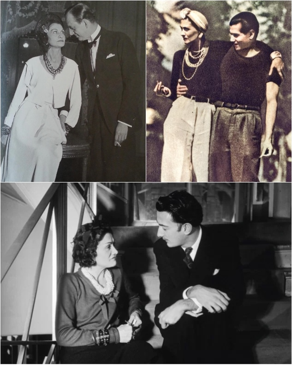 Romanov Grandükü Dmitri ile sol üstte, Rus Dansçı Serge Lifar ile sağ üstte, altta Salvador Dali ile.