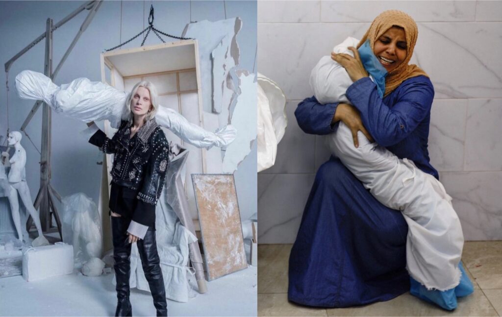 Zara’nın sınırlı sayıda özel koleksiyon diye piyasaya sürdüğü “The Jacket” reklam kampanyası bir skandala yol açtı. Reklam görselleri Filistin’de yaşananları alaya alır gibi görünen sembolizmlerle, metaforun da ötesinde olaylara doğrudan referanslarla dolu. Kefenlere sarılı irili ufaklı bedenler, yıkıntılar arasında toz toprak içinde cesetleri andıran heykeller, hatta havada asılı duran tepetaklak edilmiş Filistin haritası şeklinde bir levha bile var ve bu öylesine kadraja giren bir dekor da değil; Zara levhayı tek başına çektikleri bir görseli de Instagram’da paylaştı. Fotoğrafları gördükten sonra, kampanya adının The Jacket olmasını bile acaba “mermi gömleği” anlamına gelen jacket’a gönderme mi var diye yorumlamadan edemiyorum.