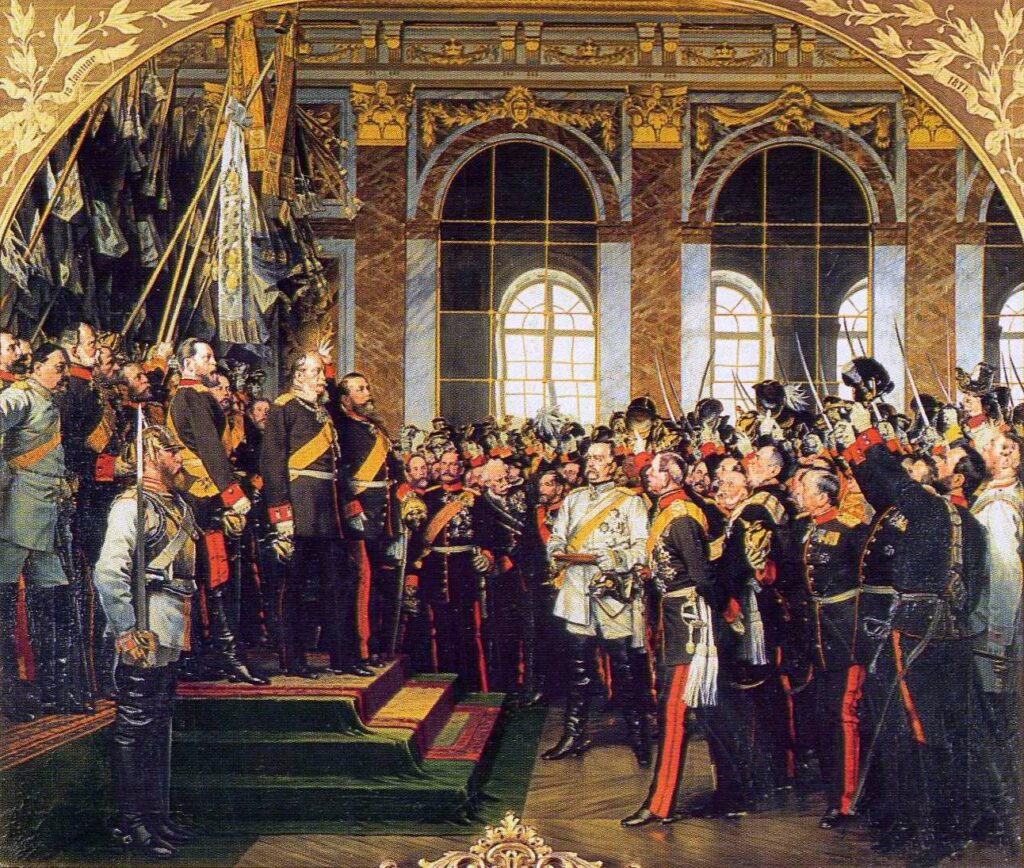 Besbelli ki bir zafer, büyük bir zafer kutlanmakta. Hem de ne biçim. Tablonun resamı Anton von Werner. Başlığı Die Proklamierung des deutschen Kaiserreiches (18. Januar 1871) (Alman İmparatorluğu’nun İlânı, 18 Ocak 1871). 1870 Fransız-Alman Savaşı’nda, Prusya ve müttefiki Alman prensliklerinin orduları önce Sedan’da Fransız ordusunu tamamen kuşatıp, teslim olan İmparator III. Napolyon’u da esir almış. Ardından Paris üzerine yürümüşler. Şimdi, Fransızların burnunu iyice sürtercesine, Alman İmparatorluğu’nu (Ortaçağın Kutsal Roma İmparatorluğu’ndan sonra, “İkinci” denecek Alman İmparatorluğu’nu) Paris yakınlarındaki Versailles (Versay) Sarayı’nın Aynalı Salon’unda ilân ediyorlar. Anton von Werner de ressam (devlet ressamı mı diyelim) kimliğiyle orada. Hızla çalışıp eskizlerini üretiyor. Sonra bunları yağlı boya tablolara dönüştürüyor. İlk ikisi, İkinci Dünya Savaşında yokolmuş. Yukarıdaki ise 1885 tarihli üçüncü versiyonu. Hohenzollern hanedanınca, “Demir Şansölye” Otto von Bismarck’a 70. yaşgünü hediyesi olarak sipariş edilmiş. Tarihte daha nice trajediye gebe bir olayın görsel tanıklığı sıfatıyla, bugüne kadar geliyor.