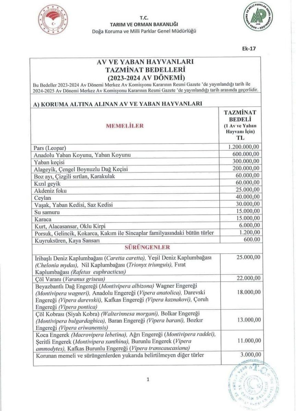 Tarım ve Orman Bakanlığı Doğa Koruma ve Milli Parklar Genel Müdürlüğü’nün 2023-2024 av dönemi için koruma altına alınan av ve yaban hayvanlarını avlamanın tazminat bedelleri yayımlandı.