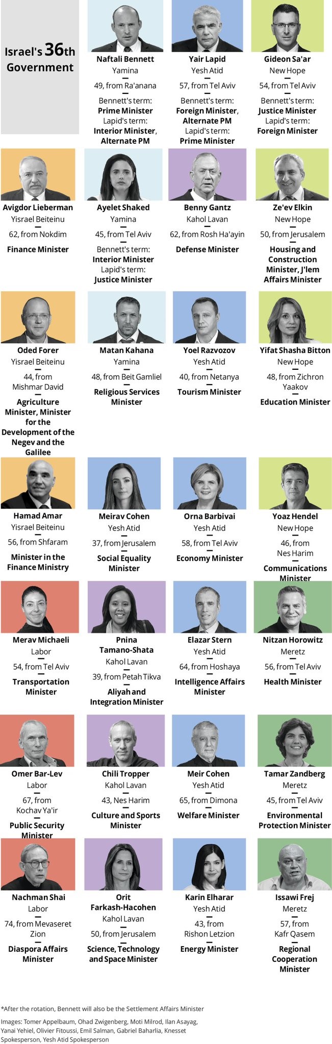 İsrail’de sekiz partili kabine de belli oldu. İki yıl sonra başbakanlık koltuğuna oturacak koalisyonun büyük ortağı Yesh Atid’in lideri eski televizyoncu Yair Lapid, İsrail’in yeni dışişleri bakanı oldu. Savunma Bakanlığı’na eski Genelkurmay Başkanı ve koalisyon ortağı Mavi Beyaz İttifak’ın lideri Benny Gantz getirilirken, aşırı sağcı görüşleriyle tanınan Bennett’in partisinden eski Adalet Bakanı Ayelet Shaked İçişleri Bakanı oldu. Mansur Abbas liderliğindeki Arap İttifakı ise kabinede bakanlık almadı.