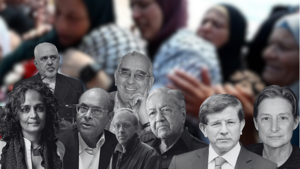 Gelecek Partisi lideri ve eski Başbakan Ahmet Davutoğlu, eski Tunus Cumhurbaşkanı Dr. Moncef Marzouki, eski Malezya Başbakanı Mahathir Mohamed, eski İran Dışişleri Bakanı Javad Zarif, eski “1967’den Bu Yana İşgal Altında Olan Filistin Toprakları’ndaki İnsan Haklarının Durumu BM Özel Raportörü” Richard Falk, Kaliforniya Üniversitesi’nden Prof. Judith Butler, “Küçük Şeylerin Tanrısı” kitabının yazarı Arundhati Roy, Harvard Üniversitesi’nden Prof. Feroz Ahmad, New York Times’ın eski Orta Doğu Büro Şefi Chris Hedges gibi isimlerin arasında 126 kişi “Küresel Aydınların Gazze Soykırımına İlişkin Vicdan Bildirisi”ni imzaladı.