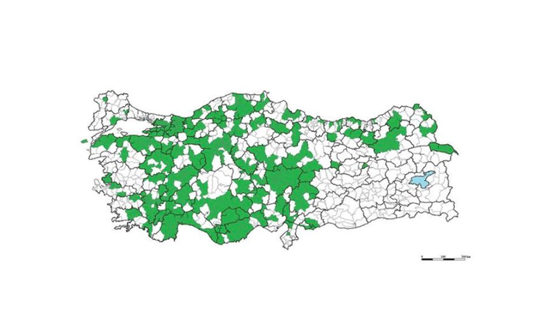 Sinan Oğan’ın yüzde 5’in üzerinde oy aldığı ilçeler yeşil renkle gösteriliyor.