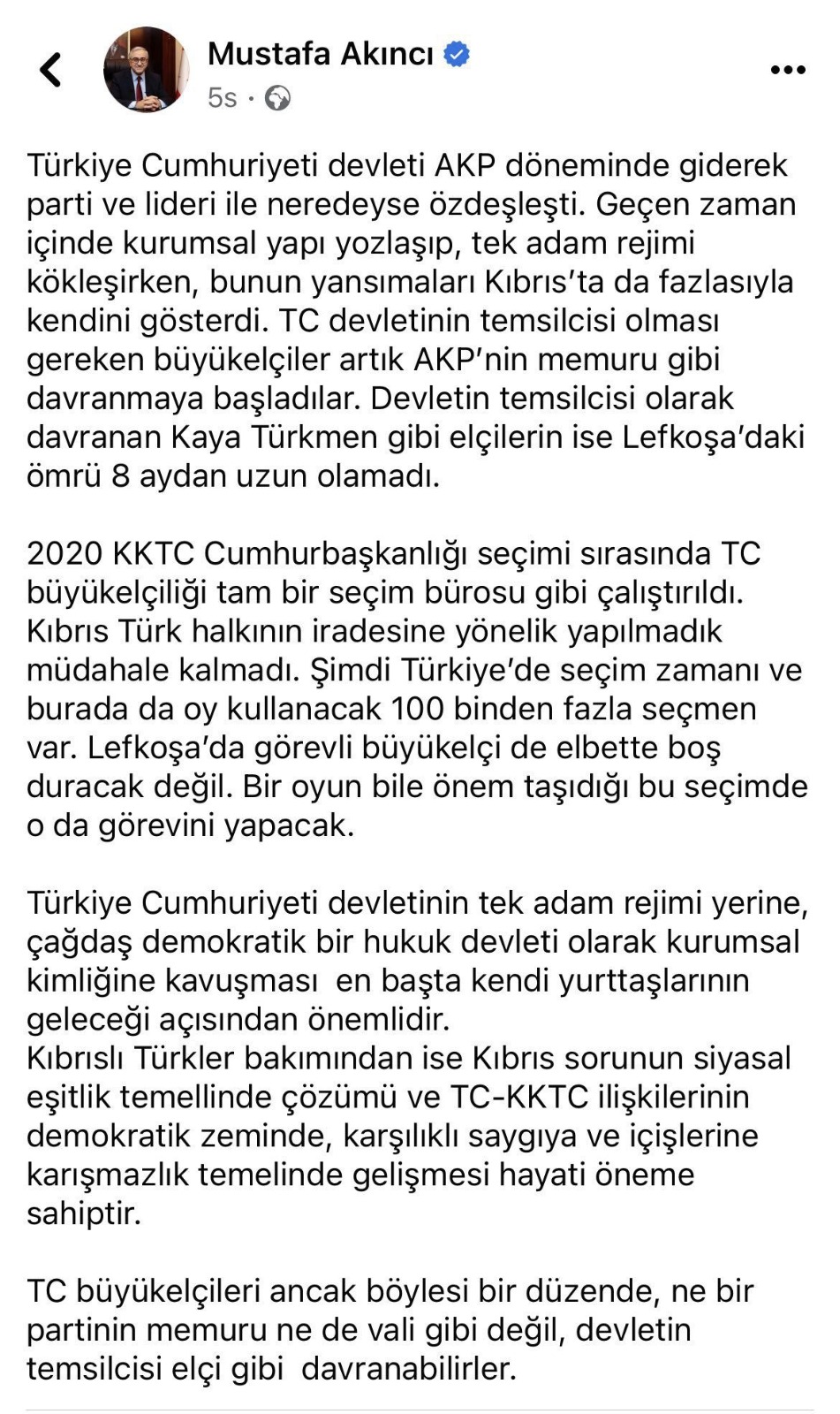 “Devletin temsilcisi olarak davranan Kaya Türkmen gibi elçilerin ise Lefkoşa’daki ömrü 8 aydan uzun olamadı. 2020 KKTC Cumhurbaşkanlığı seçimi sırasında T.C. büyükelçiliği tam bir seçim bürosu gibi çalıştırıldı. Kıbrıs Türk halkının iradesine yönelik yapılmadık müdahale kalmadı.