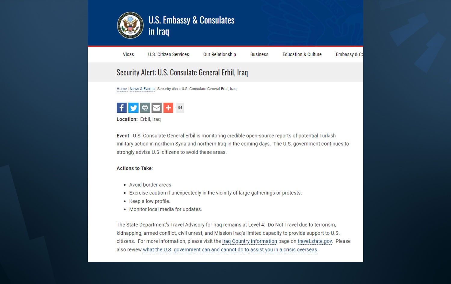 “ABD’nin Erbil Başkonsolosluğu, Türkiye’nin önümüzdeki günlerde Suriye’nin kuzeyi ile Irak’ın kuzeyinde askeri operasyon düzenleyebileceğine dair ‘açık kaynaklı’ haberleri takip ediyor. ABD hükümeti, Amerikan vatandaşlarına söz konusu bölgelerden uzak durmalarını şiddetle tavsiye eder.”