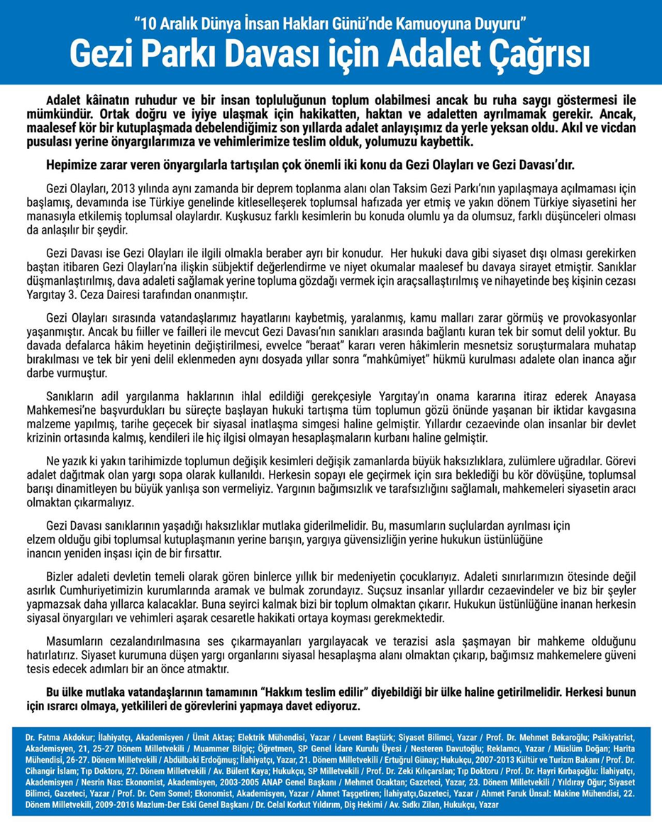 Gezi Olayları sırasında vatandaşlarımız hayatlarını kaybetmiş, yaralanmış, kamu malları zarar görmüş ve provokasyonlar yaşanmıştır. Ancak bu fiiller ve failleri ile mevcut Gezi Davası’nın sanıkları arasında bağlantı kuran tek bir somut delil yoktur. Bu davada defalarca hâkim heyetinin değiştirilmesi, evvelce “beraat” kararı veren hâkimlerin mesnetsiz soruşturmalara muhatap bırakılması ve tek bir yeni delil eklenmeden aynı dosyada yıllar sonra “mahkûmiyet” hükmü kurulması adalete olan inanca ağır darbe vurmuştur.