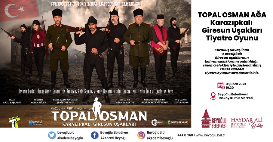 Beyoğlu Belediye Başkanı Haydar Ali Yıldız imzasını taşıyan duyuruda, “Topal Osman Ağa ve Karazıpkalı Giresunlu Uşakların kahramanlıklarının anlatıldığı ‘Topal Osman’ tiyatro oyununa tüm halkımızı bekleriz” ifadelerine yer verildi.
