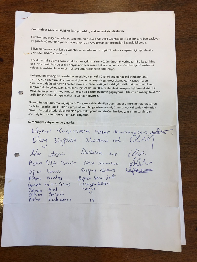 “Cumhuriyet gazetesi yöneticileri ve yazarları tutuklandıktan iki hafta, ben tutuklandıktan birkaç gün sonra gazetede çalışanlar arasından bir grup tüm çalışan ve yazarların %30-35’ine denk düşen sayıda yaklaşık 60 imzalı bir bildiri yayınlamış, bir örneğini havuz medyasından eskiden solcu bilinen sonradan ateşli iktidar savunucusu olan bir gazeteciye sızdırmış, bir örneğini de o dönem yaşı ve sağlık durumu nedeniyle tutuksuz olan vakıf başkanı Orhan Erinç’e vermişlerdi. İmza listesinin başında Aykut Küçükkaya vardı.