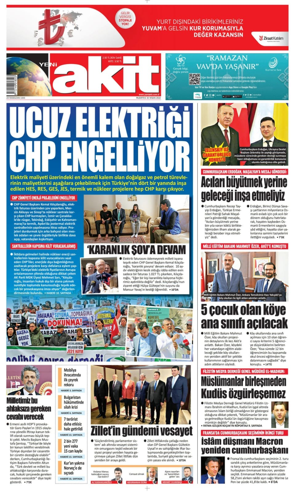 Akit gazetesinin hayat pahalılığında iktidar hariç herkesin payının olduğuna dair manşetleri devam ediyor. Daha önce “stokçu zincir marketler”in ve “et baronları”nın ipliğini pazara çıkaran Akit bu defa da elektrikteki fiyat artışlarının gerçek sorumlusunu fâş ediyor. Akit’e göre “Ucuz elektriği”, “Türkiye’nin dört bir yanında inşa edilen HES, RES, GES, JES, termik ve nükleer projelere hep CHP karşı çıkan” CHP engelliyor.