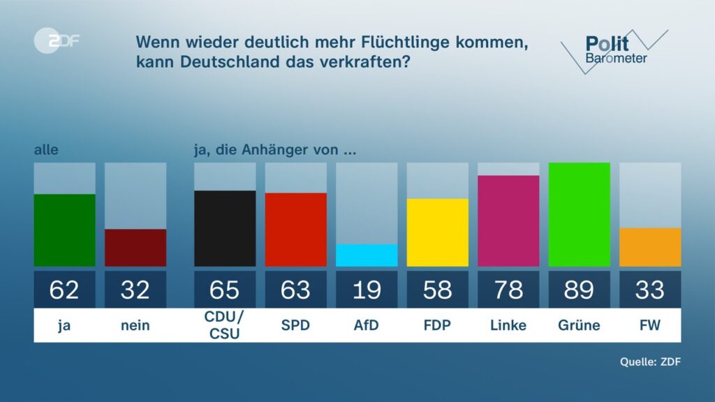 Almanya’nın en büyük partisi Hristiyan Demokrat Birliği’ne (CDU&CSU) oy verdiğini söyleyenlerin %65’i, Sosyal Demokrat Parti’ye (SPD) oy verenlerin %63’ü Almanya’nın yeni bir göç akımını yönetebileceği görüşünde.