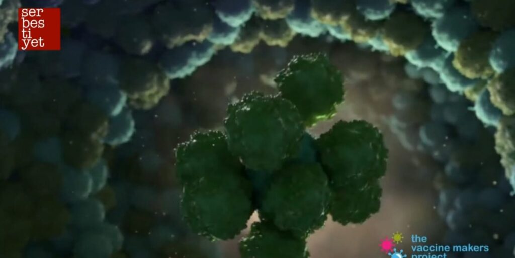 Vaccine Makers eğitim grubunun hazırladığı animasyon, aşı içinde enjekte edilen proteinlerin bağışıklık sistemini virüse karşı nasıl eğittiğini anlatıyor.
