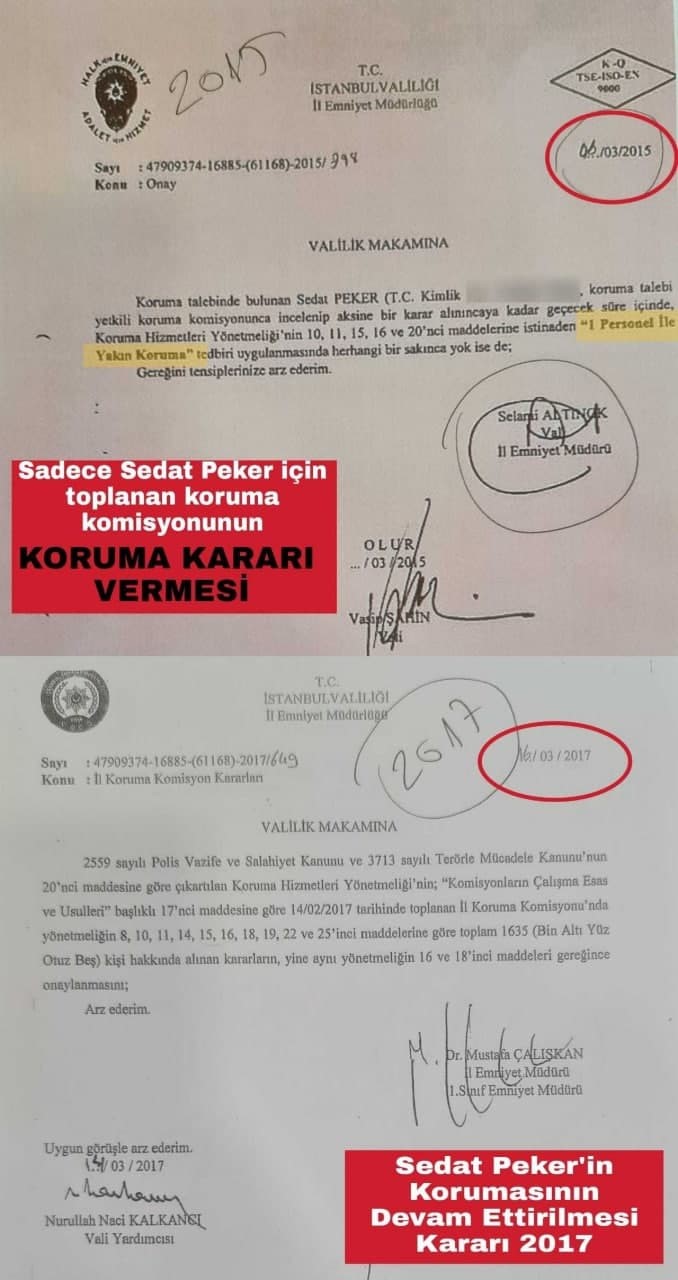 Peker’in koruma kararının uzatıldığı 2017 tarihli bir diğer belgede ise dönemin İstanbul Emniyet Müdürü ve şu anda Emniyet Genel Müdür Yardımcısı olan Mustafa Çalışkan’ın imzası görülüyordu.