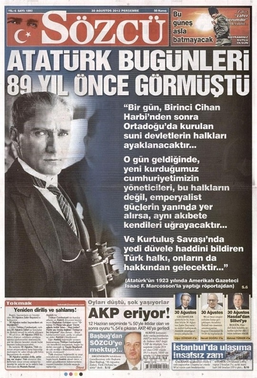 Sözcü, “Atatürk bugünleri 89 yıl önce görmüştü” manşetiyle çıktığı 30 Ağustos 2012 tarihli sayısının birinci sayfasının tamamını bu uydurma sözlere ayırmıştı.