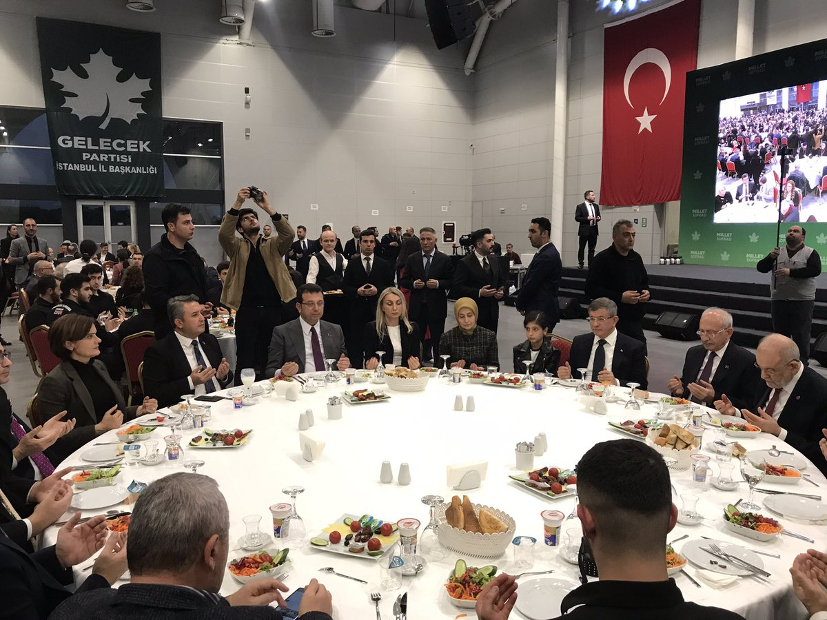 Yenikapı’da bulunan ve İBB’ye bağlı Dr. Mimar Kadir Topbaş Gösteri Merkezi’ndeki iftarda ev sahibi Davutoğlu’nun yanı sıra DP lideri Gültekin Uysal, SP lideri Temel Karamollaoğlu, İBB Başkanı Ekrem İmamoğlu ve Millet İttifakı’nın cumhurbaşkanı adayı CHP lideri Kemal Kılıçdaroğlu yer aldı.