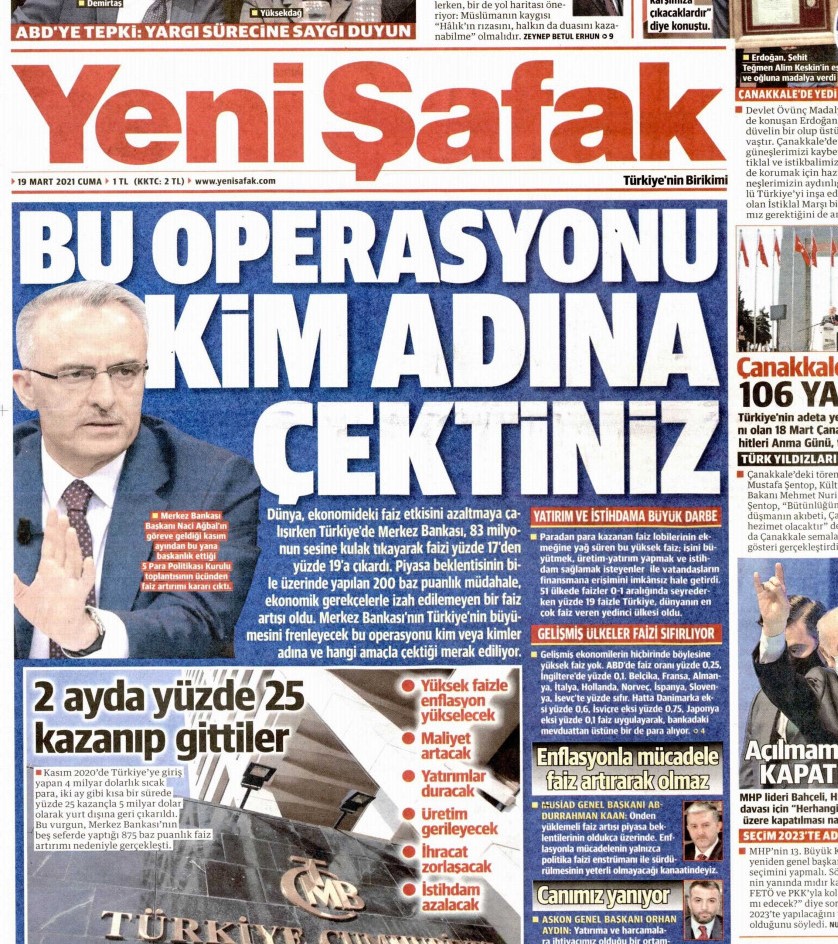 Merkez Bankası’nın (MB) dünkü (18 Mart) faiz kararının öncesinde Naci Ağbal’ı yeni faiz artışı yapmaması konusunda uyaran Yeni Şafak, MB’nin 200 baz puanlık artış kararından sonra bugün (19 Mart) Ağbal’ı doğrudan hedefe alan ve suçlayan bir manşetle çıktı: “Bu operasyonu kim adına çektiniz?”