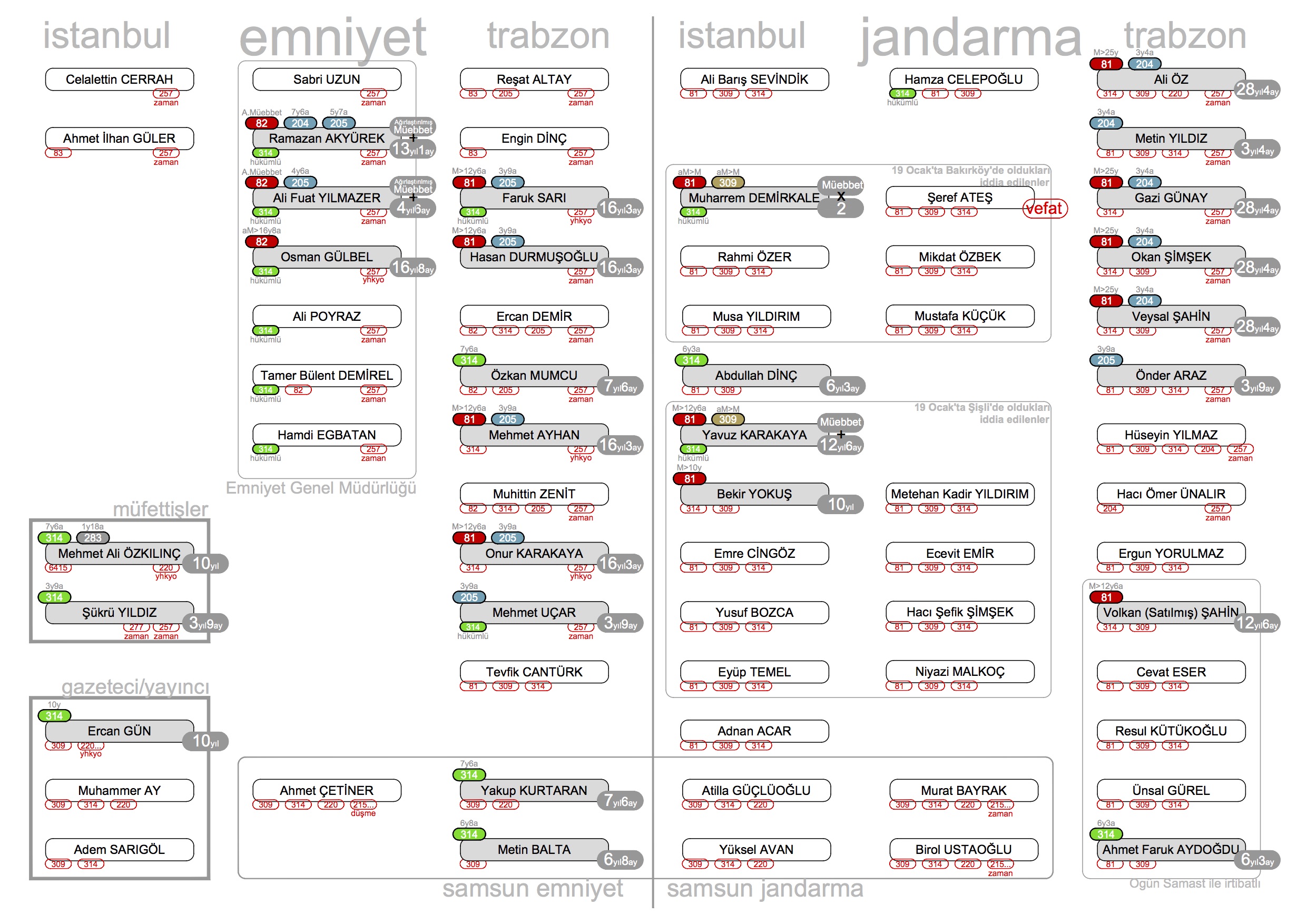 ‘Kim kimdir?’ sorusuna ilk bakışta biraz daha kolay cevap bulunabilmesi için, Jandarma ve Emniyet gruplarını da kendi içlerinde, Trabzon ve İstanbul alt gruplarına ayırabiliyoruz. Bir de, yine ‘katil zanlısı’nın yakalanmasının ardından ortaya çıkan, bol bayraklı ve bol kahkahalı kutlama görüntüleri bağlamında yargılanan Samsun grubu var; Jandarma’dan 4 kişi, Emniyet’ten 3 kişi.