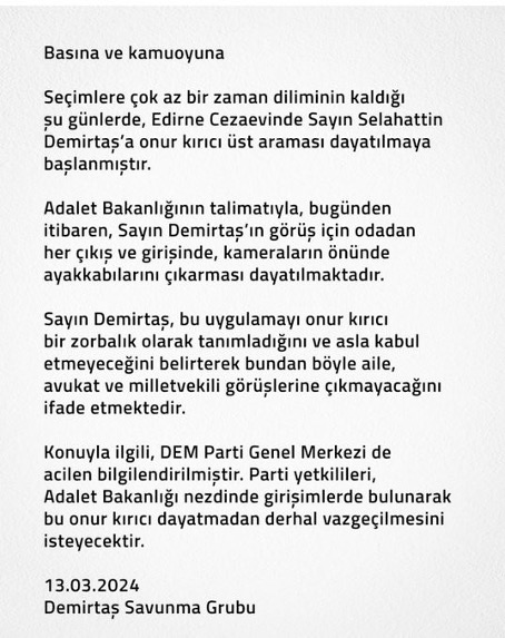 “Seçimlere çok az bir zaman diliminin kaldığı şu günlerde, Edirne Cezaevi’nde Sayın Selahattin Demirtaş’a onur kırıcı üst araması dayatılmaya başlanmıştır.
