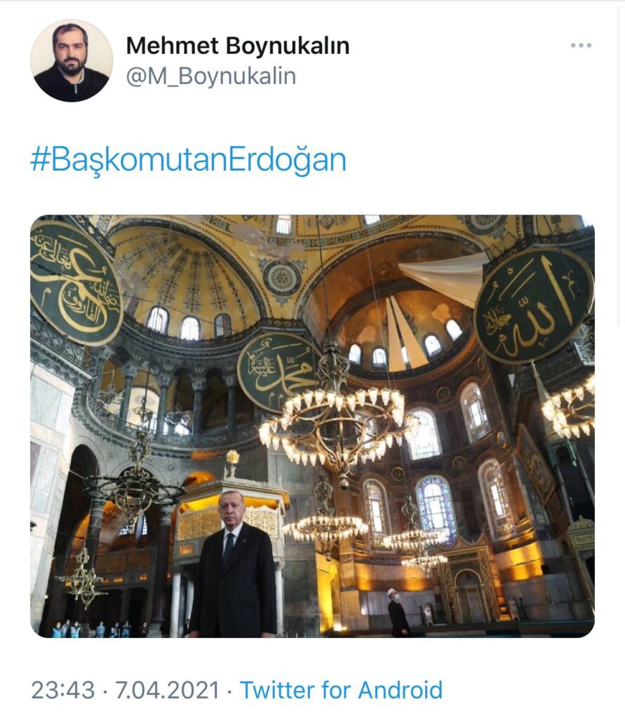 Boynukalın, sosyal medya hesabından yaptığı son paylaşımda, Cumhurbaşkanı Erdoğan’ın Ayasofya’da çekilmiş fotoğrafını paylaşarak “#BaşkomutanErdoğan” notunu düşmüştü.