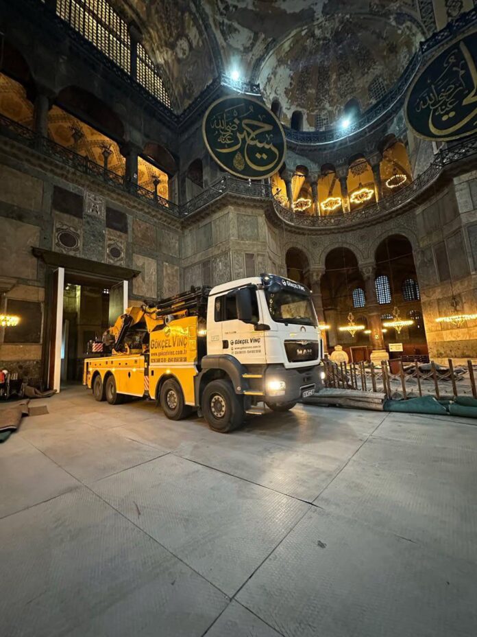 Bakanlık restorasyon çalışmalarında gerekli çelik malzemelerin taşınması için iş makinelerine ihtiyaç bulunduğunu ve Ayasofya’ya zarar vermemek için de zemine özel bir platform kurulduğunu açıkladı.
