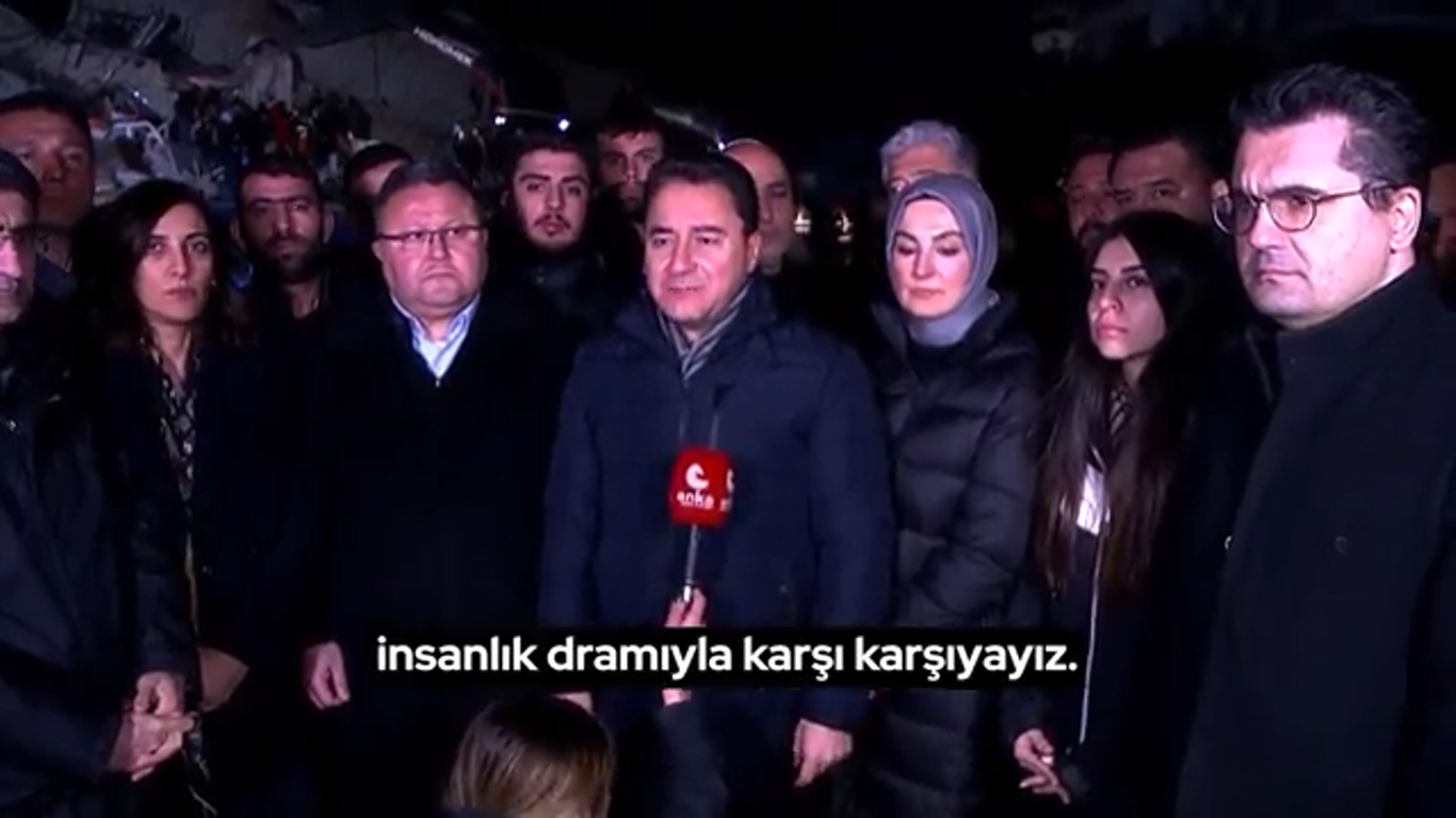 Hatay’da incelemelerde bulunan DEVA Partisi lideri Ali Babacan: “Televizyon ya da telefon ekranlarında gördüğünüz bir kurtarma faaliyetinin karşısında en az yüz tane kurtarmama, kurtaramama faaliyeti var. Tehdit diliyle böyle bir felaket yönetilmez."